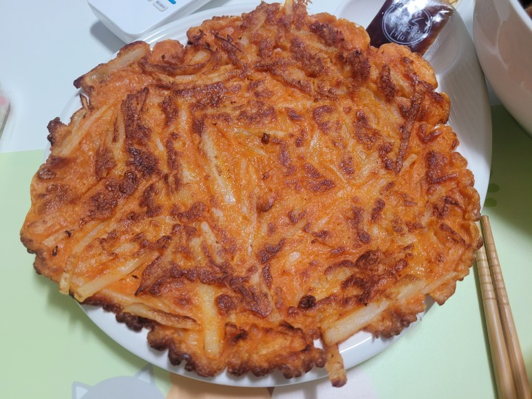 남은 감자전은 종이호일로 감싼 후 냉동보관하세요. 다시 데울 때는 오븐이나 에어프라이어를 이용하면 바삭함을 살릴 수 있어요. 전분의 레트로그레이션(retrogradation) 현상을 최소화하기 위해 180°C에서 3분만 데우는 게 핵심이에요~!