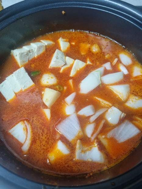 볶은 재료에 육수를 부어 끓이기 시작합니다. 이때, 끓는 육수에 두부와 대파를 넣어줍니다. 두부는 마지막에 넣어야 그 식감이 부드럽고 고소하게 유지되니, 끓어오른 후에 넣어주세요! ^^ 육수의 양은 재료가 충분히 잠길 정도로 맞춰야 하며, 끓이는 동안 간을 보면서 간장, 소금, 후추를 적당히 넣어줍니다. 이 단계에서 자신만의 고추장찌개 맛을 조절할 수 있답니다!!