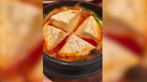 두부를 넣고 끓입니다. 두부가 익으면 대파를 넣고 한 손가락 높이의 크기로 썬 고추를 넣어주세요. 잠시 더 끓인 후 꺼내어 먹을 준비가 끝났습니다!