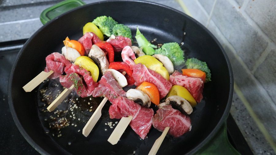 이제 본격적으로 구울 차례에요! 꼬치구이는 보통 그릴에 구워요. 그릴이 없다면 프라이팬이나 오븐을 사용해도 좋아요. 🍽️