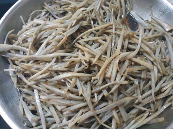 우엉이 잘 볶아졌다면, 물 1컵을 추가해줍니다. 물이 끓어오르면 중약불로 줄여서 우엉이 부드러워질 때까지 조려줍니다. 물이 거의 졸아들 때까지 조리세요.