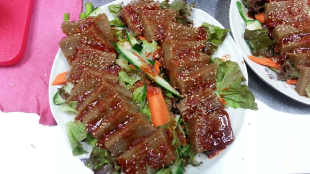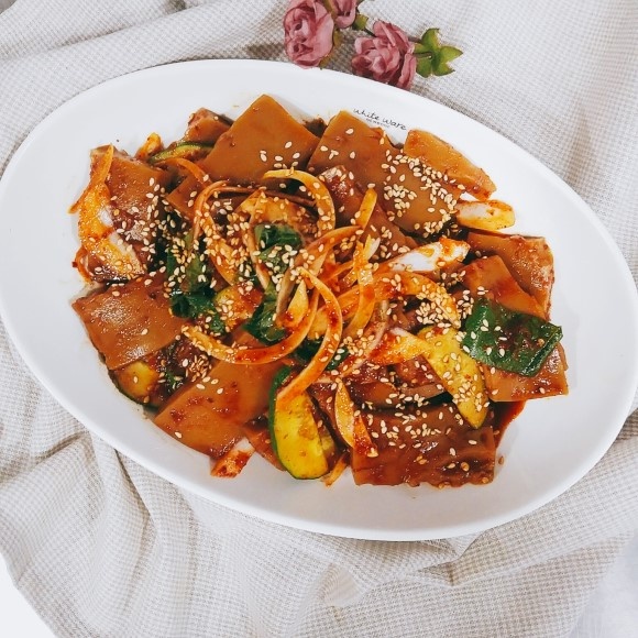 1. 도토리묵 준비: 먼저 도토리묵을 깨끗이 씻어 물기를 빼고, 한 입 크기로 자릅니다.