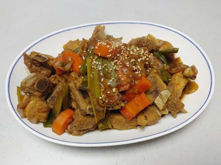이제 돼지갈비찜이 다 완성되었습니다! 🥳 고기와 채소가 잘 어우러져 맛있는 돼지갈비찜이 완성되었어요! 그릇에 담아 가족들과 함께 맛있게 드세요~ 😆