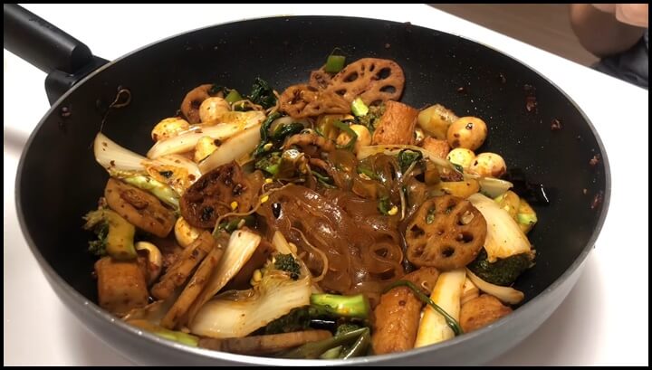 - 볶은 재료에 마라 소스를 넣고, 잘 섞어주면 맛있는 마라샹궈가 완성됩니다!