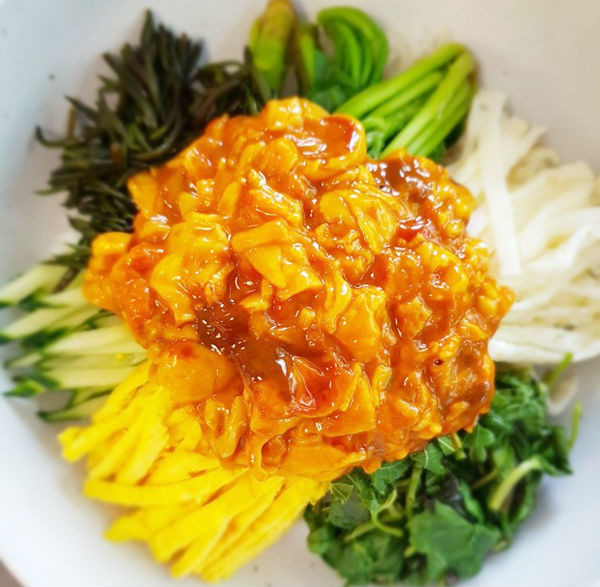 이제 고명으로 계란 후라이, 깻잎, 시금치, 당근, 오이를 올려주면 완성! 계란은 반숙 상태로 올려서 고소함을 더하고, 깻잎은 상큼한 맛을 더해줍니다. 시금치, 당근, 오이는 아삭한 식감을 제공하면서 멍게비빔밥의 맛을 더욱 풍부하게 만들어줘요! ^^