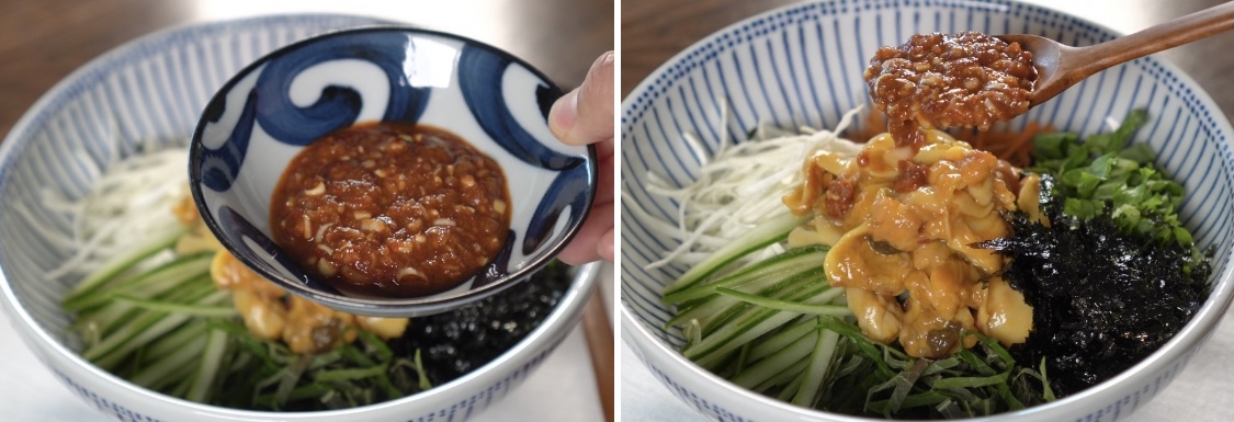 준비된 따뜻한 밥에 고추장과 참기름을 넣고 잘 섞어주세요. 고추장의 양은 취향에 맞게 조절하시면 되며, 매운맛을 원하시면 고추장 양을 늘리세요! 고추장의 붉은 색과 참기름의 고소한 맛이 밥과 잘 어우러지면, 멍게비빔밥의 기본 맛이 완성됩니다. :)
