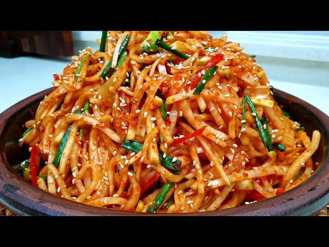 - 무와 당근 준비하기: 무는 껍질을 벗기고, 깨끗이 씻은 후, 채 썰어줍니다. 당근을 사용하는 경우에도 같은 방식으로 채 썰어줍니다. 채 썬 무와 당근을 큰 볼에 넣고, 소금을 뿌린 후 10분 정도 절여줍니다. 이 과정은 무의 수분을 제거하고 맛을 더 진하게 만듭니다. :)