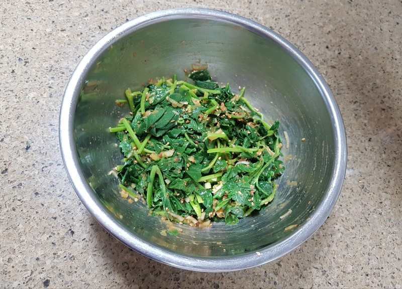 나물을 데친 후 물기를 완전히 제거하지 않으면 양념이 골고루 배지 않아 무침의 맛이 떨어질 수 있어요. 손으로 꼼꼼히 물기를 꼭 짜주는 것이 중요한 포인트입니다. :) 물기가 남으면 양념이 묽어지니 주의하세요!