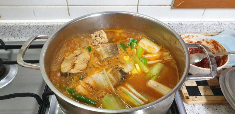 동태를 넣고 중간 불에서 뚜껑을 덮어 국물이 끓도록 합니다. 동태가 익으면 다진 마늘과 대파를 넣고 한 손끝 간을 해줍니다.