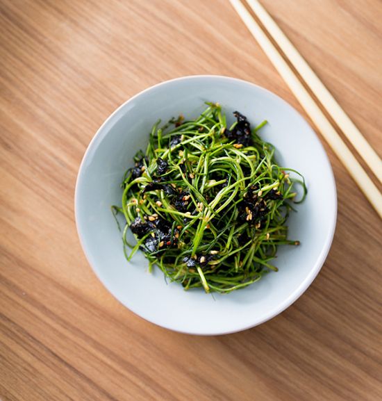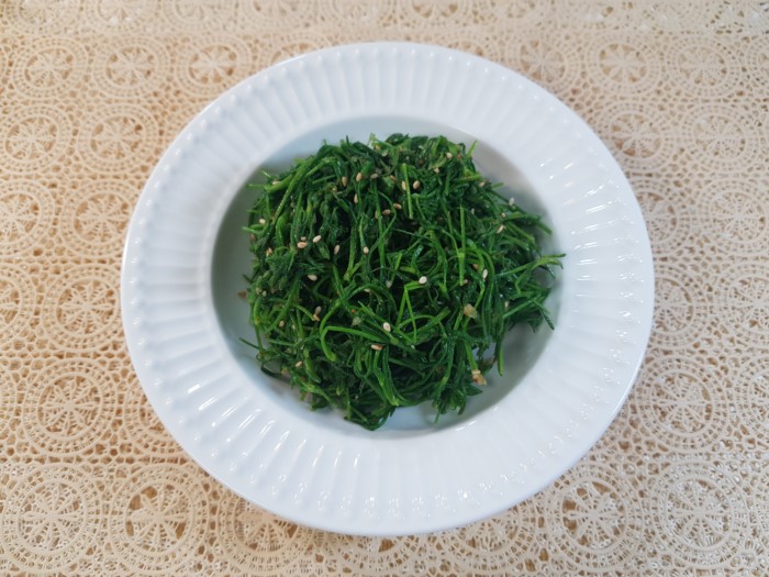 세발나물이 식으면, 깨끗한 주방 타올이나 체를 이용해 물기를 완전히 제거해 주세요. 물기가 남아 있으면 무침이 물러질 수 있으니 주의해 주세요. :)