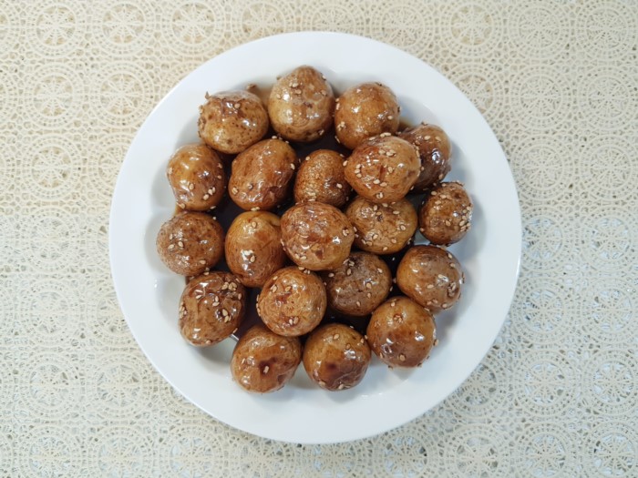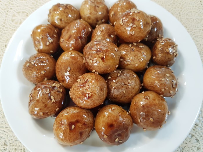 감자가 잘 익었다면 마지막으로 참기름을 살짝 두르고 깨소금을 뿌려 마무리해줍니다. 이제 완성된 알감자조림을 접시에 담아 맛있게 즐기시면 됩니다~! ^^