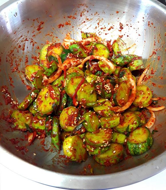 준비된 양념장을 절인 오이에 넣고 고루 섞어줍니다. 양념이 오이에 잘 스며들도록 골고루 버무려주세요. 이때 손으로 섞으면 더욱 잘 배어듭니다.