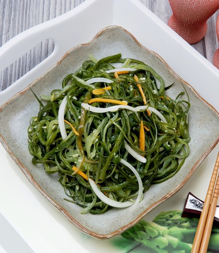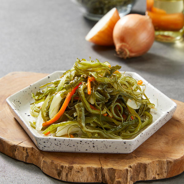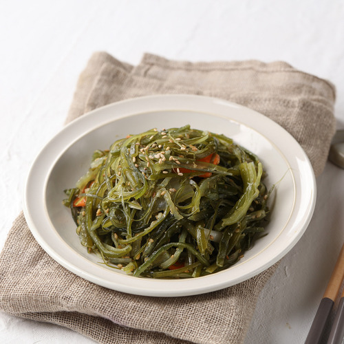 미역줄기볶음을 접시에 담아 부드러운 참기름 향이 가득한 요리를 즐겨보세요. 밥 위에 올려 먹으면 더욱 맛있습니다!