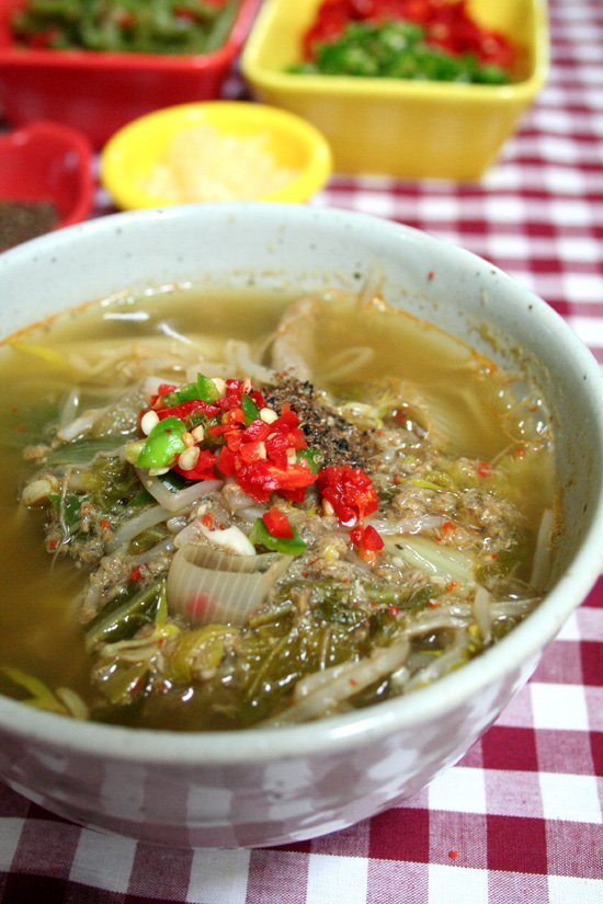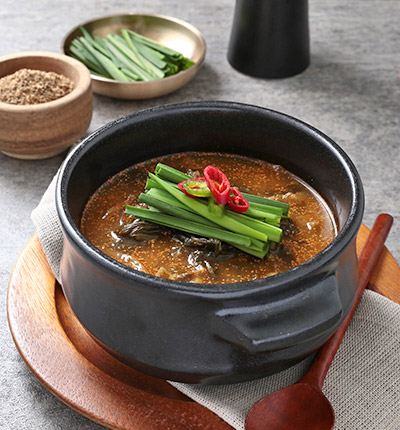 추어탕이 완성되면 불을 끄고 그릇에 담아줍니다. 대파나 고추 등을 곁들여 내용물을 감칠맛나게 즐길 수 있습니다.