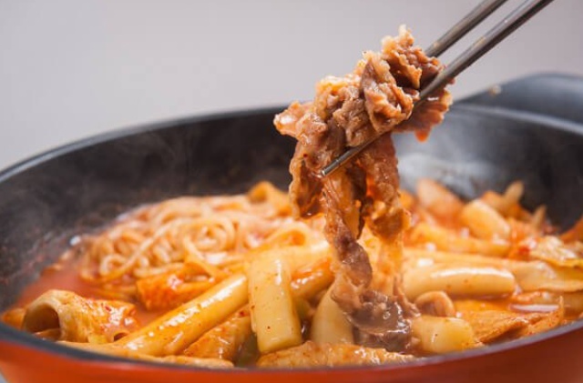 먼저 팬에 식용유를 두르고, 차돌박이를 넣어 중불에서 볶아주세요. 차돌박이가 부드럽게 익으면 다진 마늘을 넣고 함께 볶아요. 차돌박이가 잘 익었을 때, 황금 소스를 넣고 볶아 주세요! 이때, 소스가 잘 배도록 잘 섞어주는 게 포인트에요!