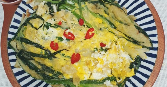 3. 계란 코팅: 팬에 기름을 두르고 반죽을 얇게 펴준 후, 풀어놓은 계란을 위에 골고루 뿌려주세요. 계란은 마에야르 반응을 일으켜 황금빛 갈색과 풍미를 더합니다.