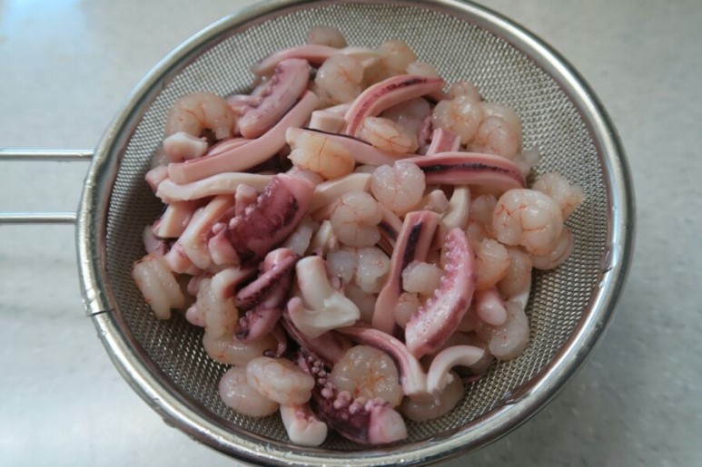 - 해물 믹스를 잘게 썰어서 반죽에 넣습니다. 해물은 되도록 신선한 것을 사용하는 게 중요해요!