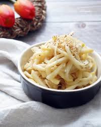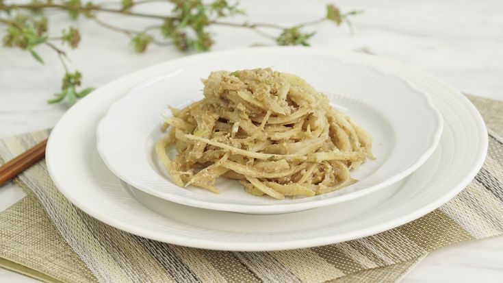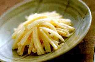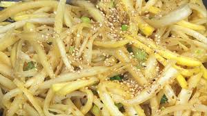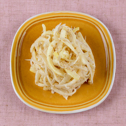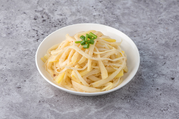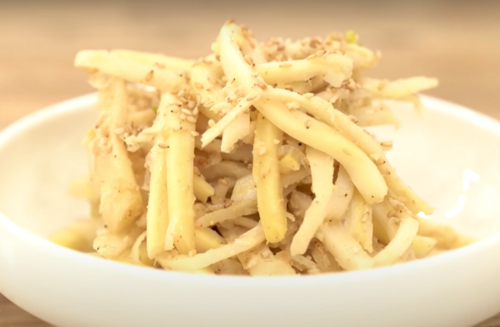 - 도라지 준비: 신선하고 탄력 있는 도라지를 깨끗이 씻어서 흐르는 물에 담가 물기를 뺀 후, 얇게 채 썬다.