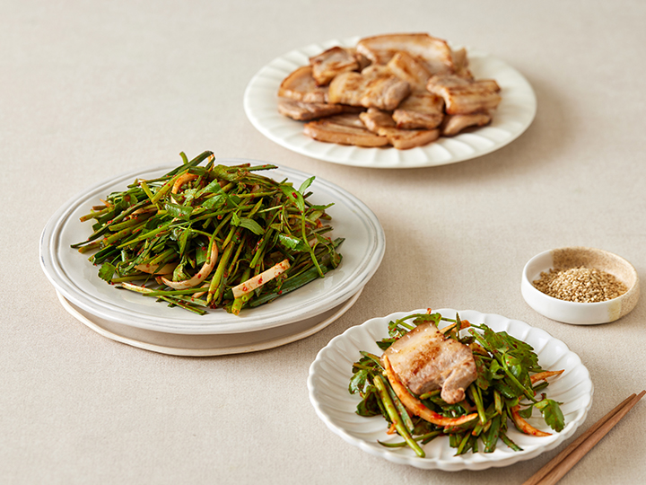 Q: 미나리무침을 먹을 때 함께 어울리는 음식은 무엇인가요?